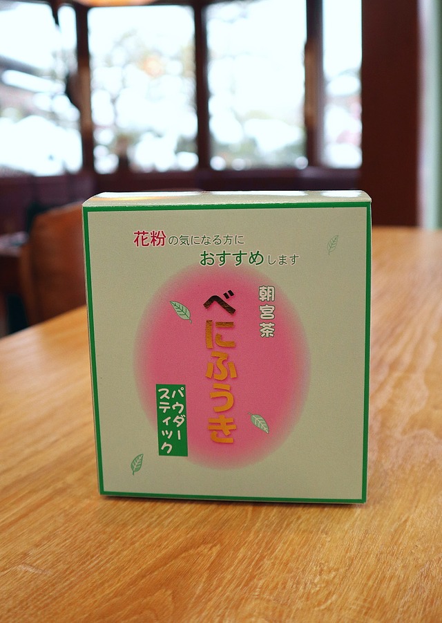 「べにふうき」は、メチル化カテキンを多く含み、 アレルギーを抑制する可能性が高いと知られています。 信楽高原朝宮で育った「べにふうき」を100%使い、 いつでも取っていただけるように、パウダースティックにしました。 特に藤田園の「べにふうきパウダー」は、100g中に、 およそメチル化カテキンが1500mgも含まれている、 濃度の高いもので、とても有効です。 そのまま水で流し込むのもいいですし、 ペットボトルの水に混ぜておいて、少しずつ摂取するのもいいと思います。 【送料について】 ◆佐川急便送料・・藤田園からの場合 近畿・東海・北陸・中国・四国・・・600円 関東・信越・九州・・・660円 東北・・770円 沖縄・・1200円 北海道・・1200円 名称:べにふうき粉末茶 原材料名:緑茶(品種べにふうき) 原料原産地名:滋賀県(朝宮) 内容量:12g(1g × 12袋入り) 花粉の気になる方にオススメします。 いつまでもすっきりと輝き続けたいあなたの生活を応援します。